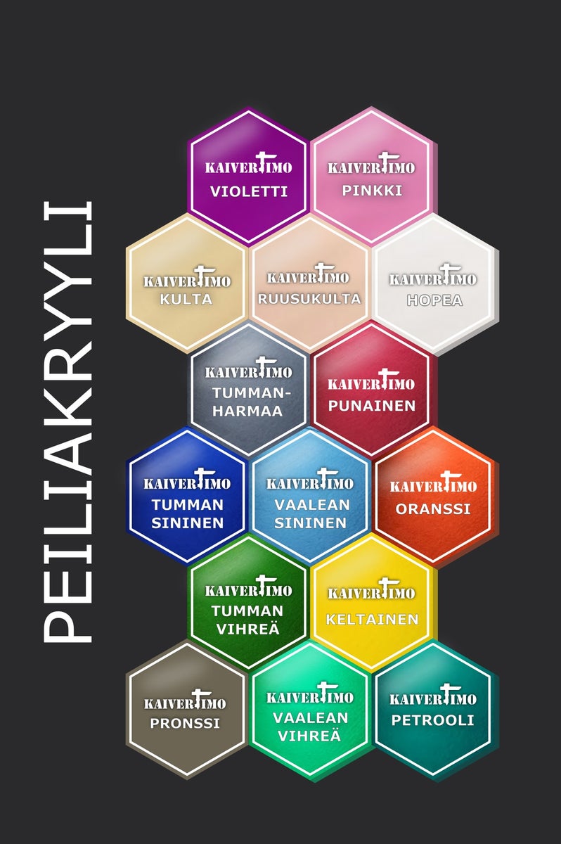 Peiliakryyli Peiliakryyli on materiaali joka koostuu akryylistä johon on lisätty peilipinnoite, mikä antaa sille peilin kaltaisen heijastavan ominaisuuden. Peiliakryyli heijastaa valoa ja on todella näyttävä materiaali niin kylteissä kuin muissakin askaretuluissa. Valitse peiliakryyli luomaan näyttäviä ja tyylikkäitä elementtejä, jotka heijastavat persoonallisuuttasi ja tyyliäsi. Huomioithan että peiliakryylin tausta on harmaa, eli peilaava pinta on vain tuotteen toisella puolella. Peiliakryyliä ei saa puhdistaa vahvoilla kemikaaleilla! Peilaavan pinnan takia peiliakryylin pinta on erityisen herkkä naarmuille. Peiliakryylien liimaamiseen suosittelemme liuotinvapaata liimaa. (vahvat liimat voivat sulattaa peilipinnoitteen). Kun peiliakryyliin tehdään kaiverruksia, on tärkeää olla erityisen varovainen ihokosketuksen ja hikoilun suhteen. Hiki ja kosteus voivat tunkeutua akryylin ja taustan väliin, mikä voi vahingoittaa kaiverrusta. Siksi suosittelemme, että peiliakryylin ei kosketa voimakkaan liikunnan aikana. Korkealaatuinen eurooppalainen ja yhdysvaltalainen peiliakryyli!